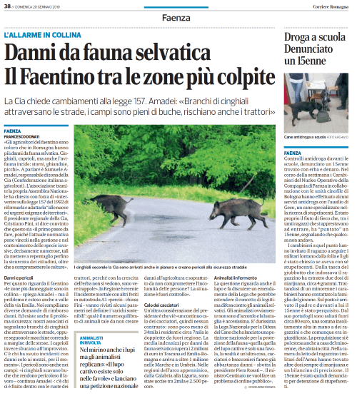 Il Corriere Romagna del 20 gennaio 2019: “Danni da fauna selvatica. Il faentino fra le zone più colpite”. La Cia chiede cambiamenti alla Legge 157. Amadei: “Branchi di cinghiali attraversano le strade, i campi sono pieni di buche, rischiano anche i trattori”.
